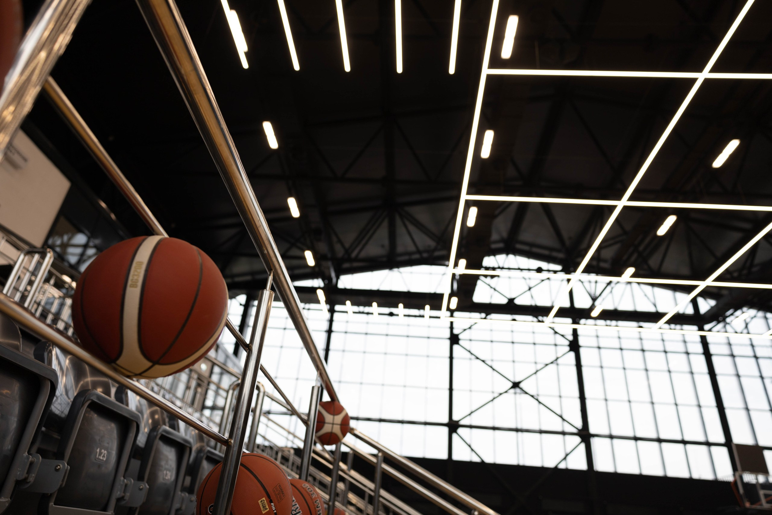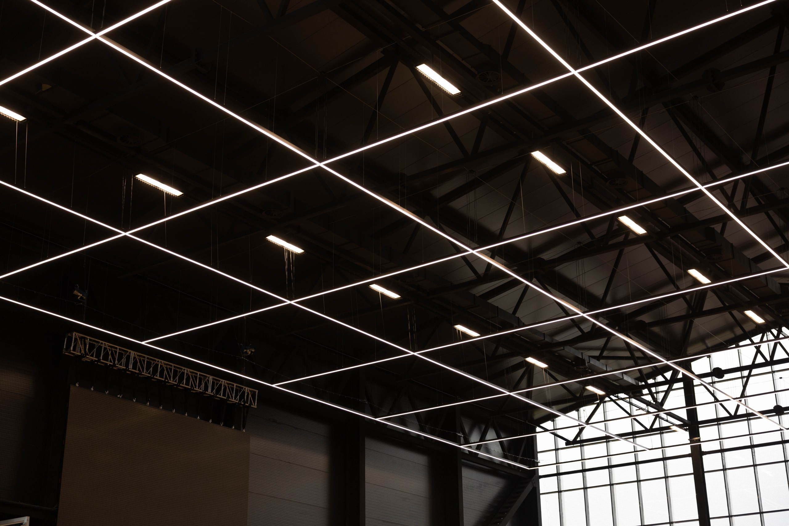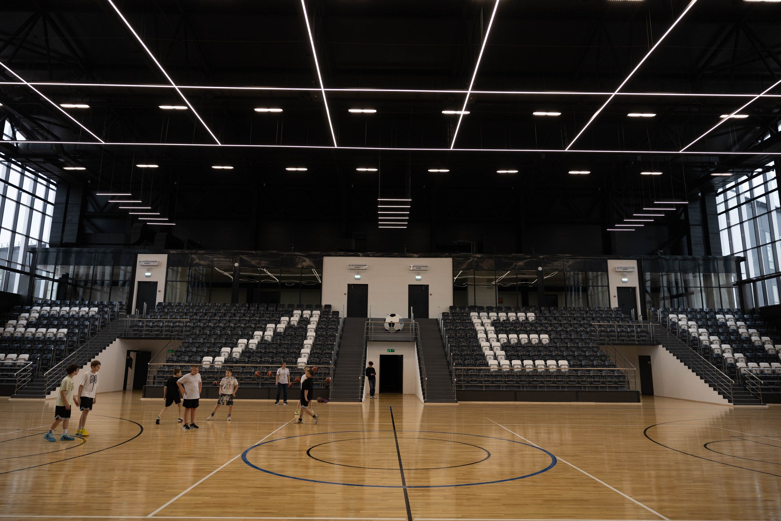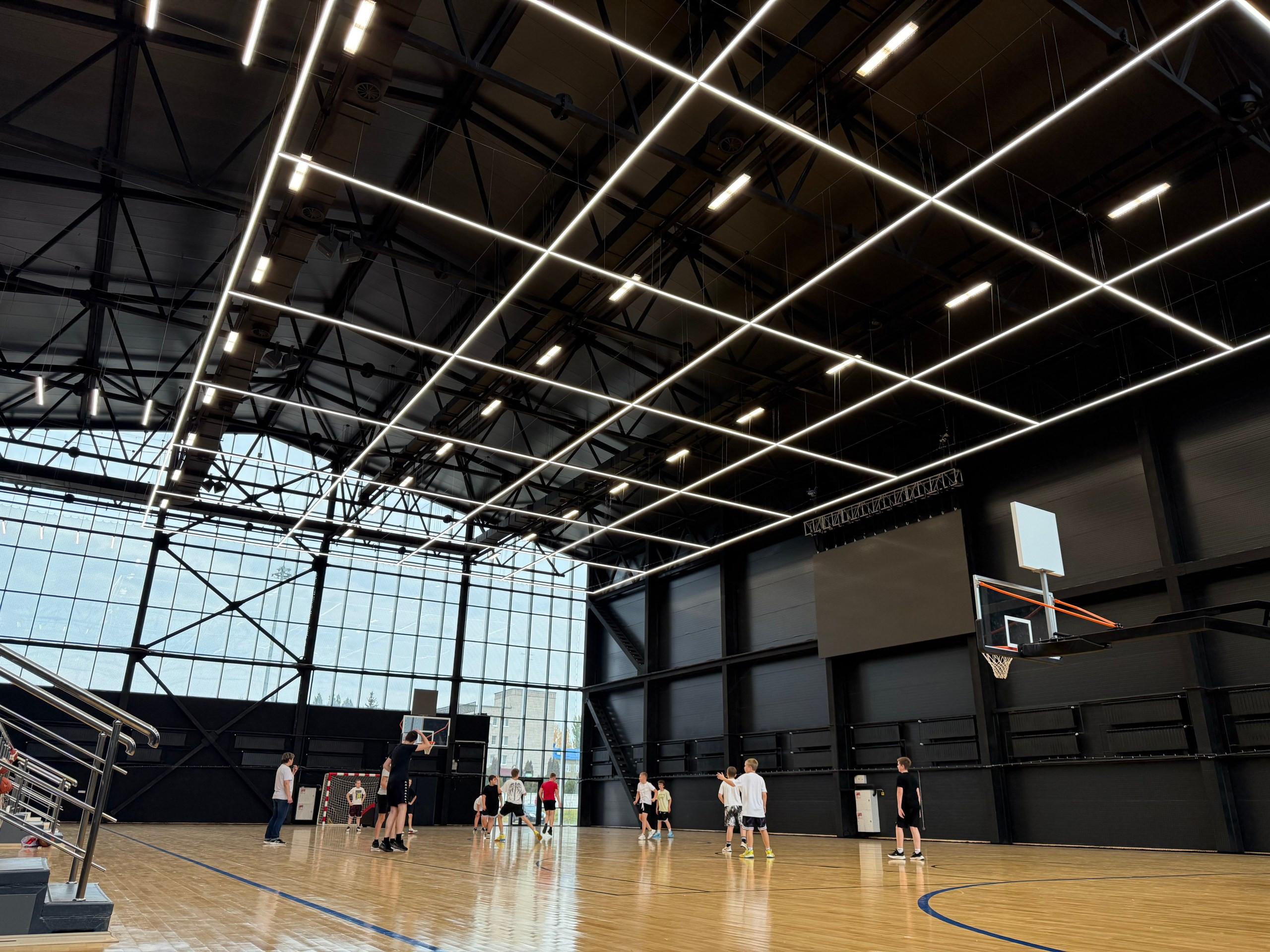 • Уникальный дизайнерский модуль: крупногабаритный светильник, спроектированный по эскизу дизайнера и повторяющий форму баскетбольного поля — рабочий свет + визуальный бренд арены.